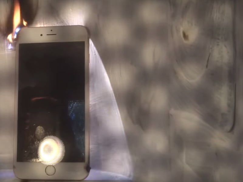 He pulls the battery out of the incinerated phone, too, which shows that’s it’s about 14 inches long! That’s a lot of battery to fit inside such a slim device, a veritable tapeworm of a battery. Irwin has fun with the video, pulling out the “Hydro Sonic boooOOooom Blaster” to cool down the phone. He got his favorite comment from it: “BEHOLD! Praise the hydrosonic blaster, our lord and savior, may the almighty boom extinguish the unholy flames of consumerism.”