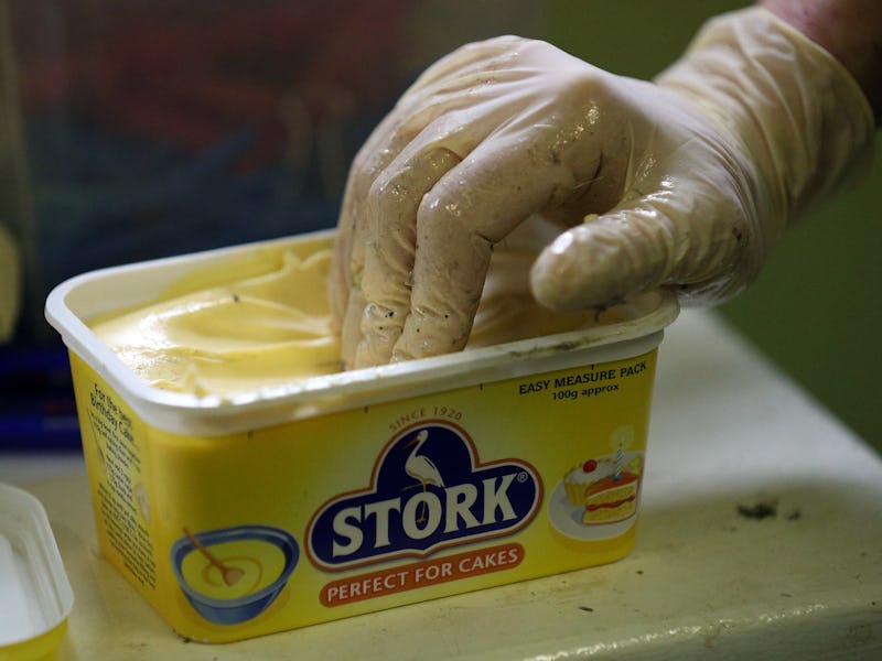 And just to make sure margarine buyers knew they weren’t getting the “genuine article,” some states either banned margarine manufactures from adding yellow dye (in Wisconsin, selling yellow margarine remained a crime punishable by jail time until 1967), or mandated that all margarine products be dyed with alternative colors: red, brown, black, or most interestingly, bright pink.