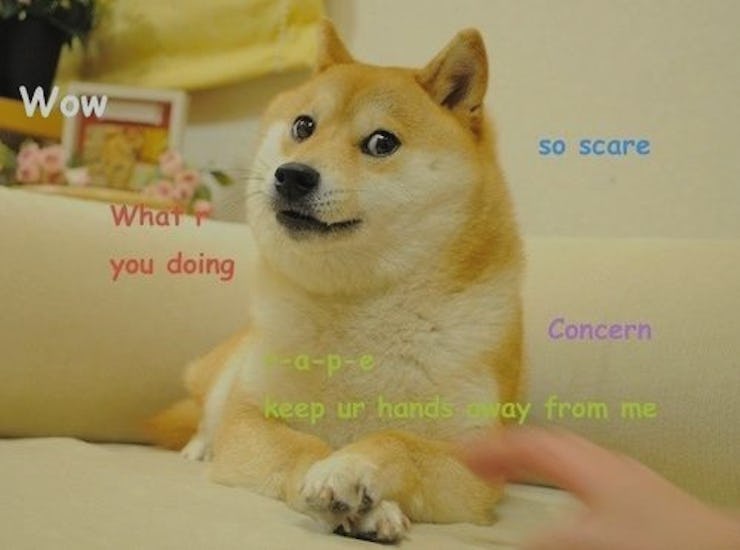 Doge: an Internet fad or meme typified by an image of a dog of the Shiba Inu breed accompanied by very short phrases that humorously represent the dog’s imagined thoughts and use the wrong modifiers or shortened word forms, as “such dignified” or “amaze.”