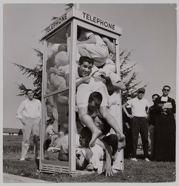 Cars weren’t the only tight spots worthy of trying to smash you and 20 of your closest friends into. In part due to a Life magazine photo essay documenting South African college students’ attempt at setting the first Guinness-approved cramming world record, phone booths became the international cramming space of choice. College kids lubed up and jammed themselves into phone boxes from Modesto to Auckland.