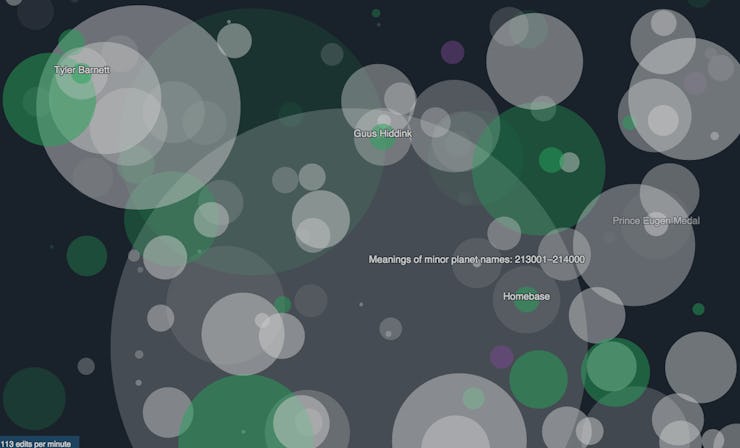 Listen to Wikipedia is a piece of open source software created by former college classmates Stephen LaPorte and Mahmoud Hashemi. The pair met at a Wikipedia hackathon and started Hatnote, a site that features all order of Wikipedia-related information: data visualizations, interactive maps, even a program that will email you the most-edited Wikipedia article of the week.