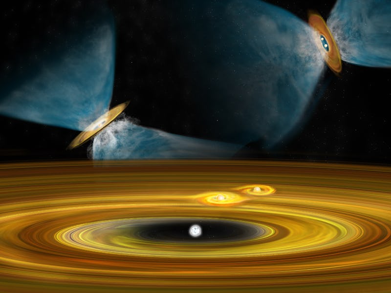 These findings illustrate how suns are formed in relation to each other, but they don’t totally rewrite the prior model, which goes something like this: As gravity causes giant clouds of gas and dusk to settle into a growing core, a rotating disk of the leftover material begins swirling around it, slowly collapsing into the center. Over time, the temperature and pressure in the core builds, triggering the thermonuclear reactions that cause the formation of a young star.