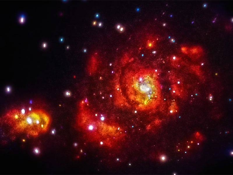 The evidence for these powerful galactic belches comes by way of new data from NASA’s Chandra X-ray Observatory. The black hole, located within the small galaxy NGC 5195, is one of the closest to Earth. It’s thought to be burping up gas after a “meal” of nearby stars and gas, as study leader Eric Schlegel, Ph.D., put it in a release.