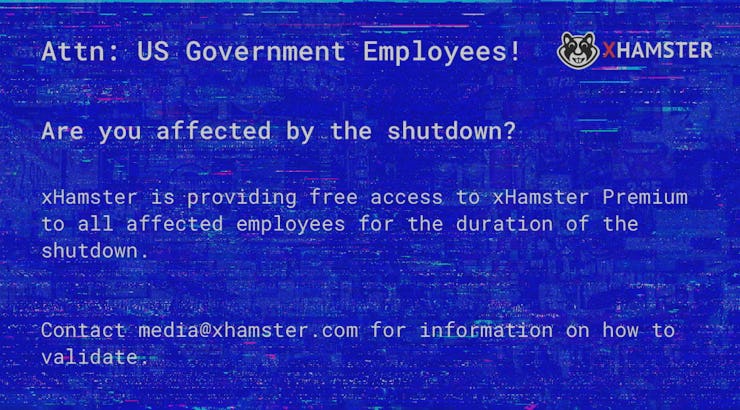 Cheer up, government employees. Nobody knows when you’ll see your next paycheck, but at least there’s free porn. And premium porn, at that. Starting today on website xHamster, federal workers can watch anything they want — including premium-only vids — at no charge. Because as vice-president Alex Hawkins says, no one should have to choose between paying the rent and rubbing one out.