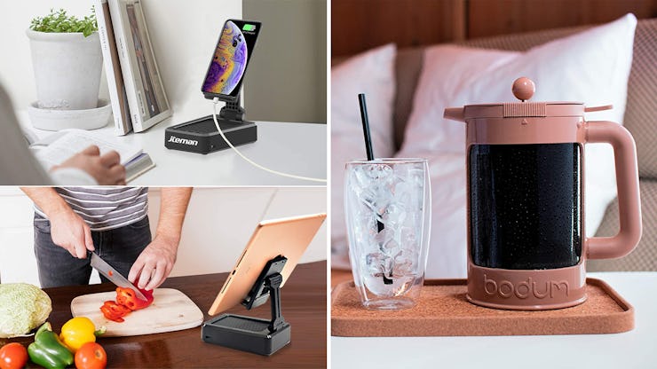 When you want to follow a recipe or share a YouTube video, set your phone in this stand with built-in Bluetooth speaker. That way, you can go hands-free while amplifying sound. It’s stable enough — and roomy enough — to handle a tablet, and there’s a channel for a charging cable to slip through. It makes a great charging stand for listening to music in bed, and folds up for travel.
