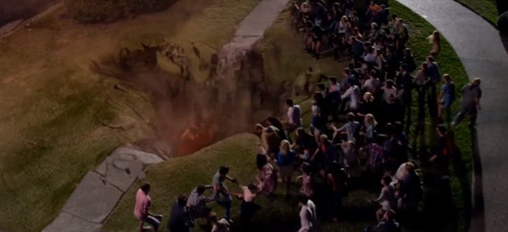 The plot of This Is the End is brutally simple. After Seth Rogen drags his friend Jay Baruchel to a fancy Los Angeles party, the Rapture occurs, and all the good people on Earth levitate straight up to heaven, leaving the sinners behind to repent or perish. Of course, none of the celebrities at Franco’s party get raptured, and the crowd doesn’t even realize something is wrong until a giant sinkhole to hell opens up in the front yard.