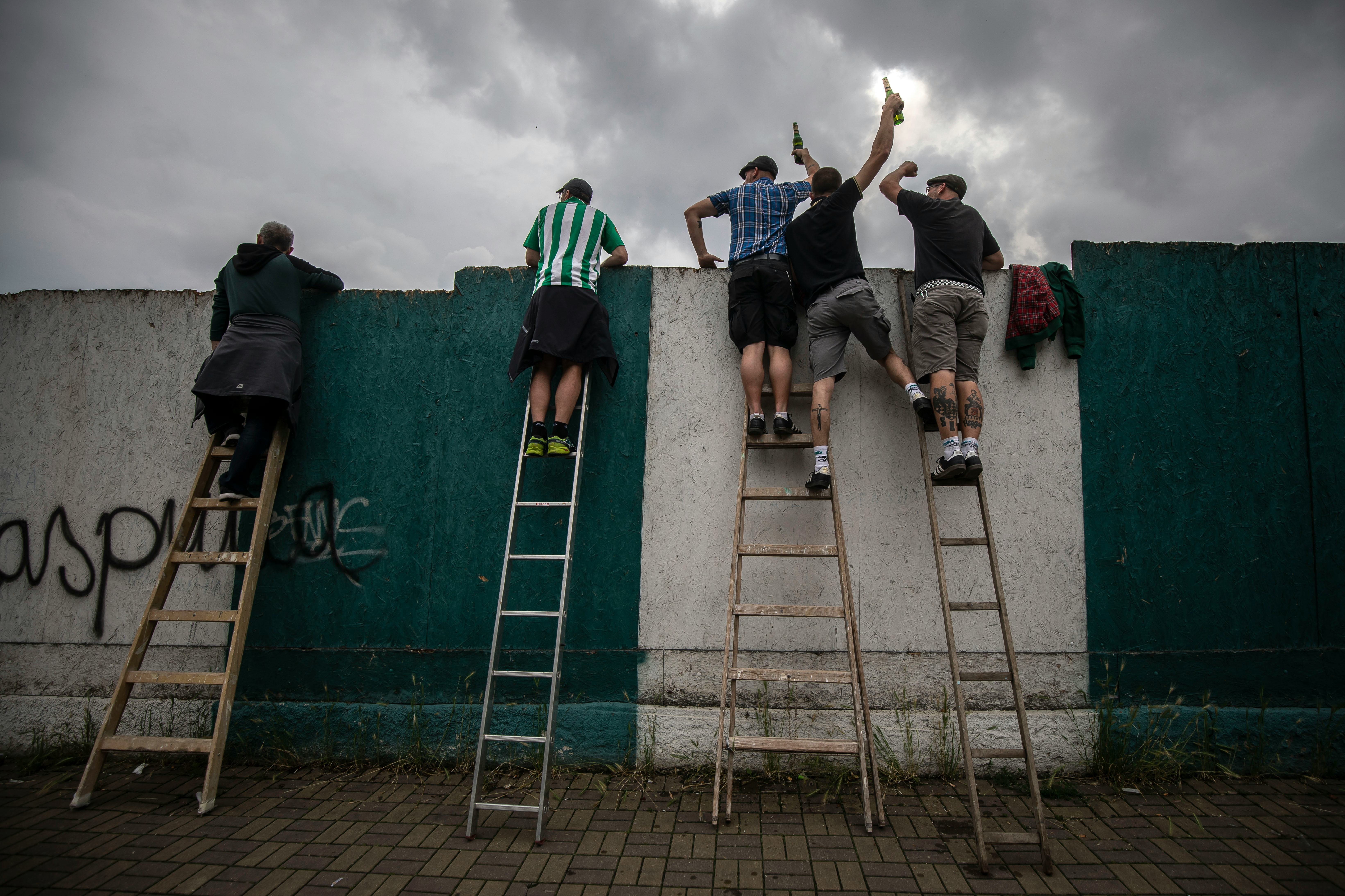 Football fans raise their drinks as they stand on ladders to peer over a wall as they watch a Czech First League match between Bohemians 1905 and FK Jablonec at Dolicek Stadium on June 14 in Prague. Matches are closed to the public.