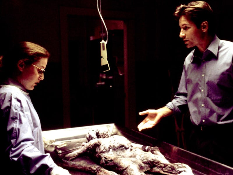 To Scully, Mulder — who believes his own sister was abducted by aliens — is himself something of an alien. He’s an artifact of a less rational age, unbeholden in discipline to the laws of physics, and instead guided more by the sentiment of his office UFO poster: “I want to believe.” In the pilot, she tempers his schoolboy excitement over the discovery of inhuman remains with the sober pathologist’s assessment that they likely belong to a chimpanzee or orangutan, not an extraterrestrial. With a later werewolf case, she suggests more plausibly that they’re dealing with a delusional man who suffers from clinical lycanthropy.