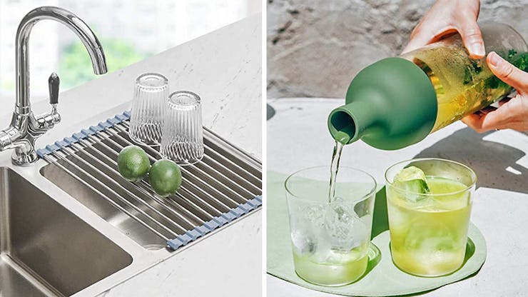 Turn part of your sink into a minimalist drying mat — that lets water drip right down the drain — by unrolling this roll-up dish drying rack. The stainless steel rods are impervious to water and heat so you can set a hot pan on it. It makes a good cooling rack, in a pinch, too.