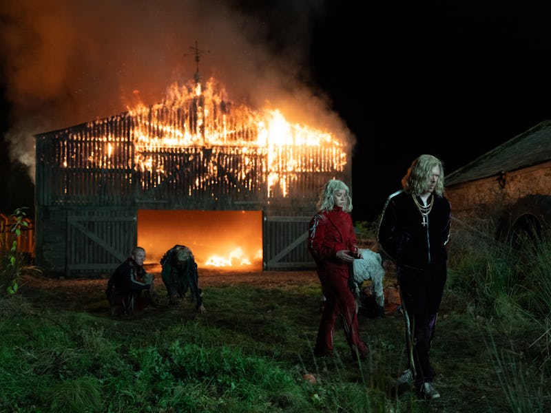 Layered with the imagery of skin flopping on the floor and guts hanging out was the images of children clad in tracksuits and raggedy blonde wigs — costumes that mimic the signature look of Jimmy Savile, a beloved figure of children’s TV who was revealed to be an abuser after his passing in 2011. But time froze in 2002 in the world of 28 Years Later, and the irony escapes Sir Lord Jimmy Crystal and his followers (who are also all named Jimmy in his cult).