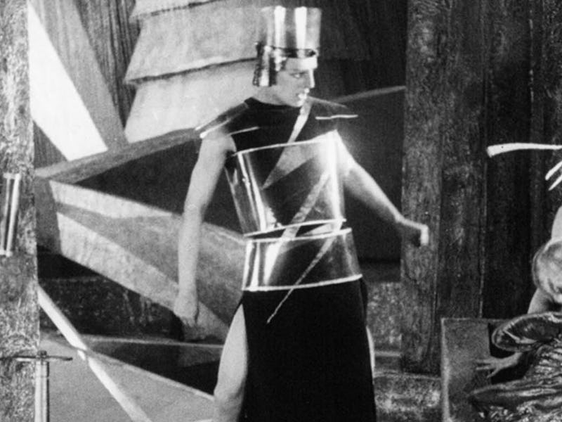 It’s in these Martian sequences that Aelita’s impact on sci-fi film can really be observed. The Mars of Los' dreams is filled with constructivist sets and extravagant costumes, the latter designed by Cubo-Futurist artist Aleksandra Ekster, a Ukrainian colleague of Pablo Picasso. The costume’s oblique shapes, born of industrial materials like aluminum, acrylics, and steel, provided modern aesthetics that later appeared in the sets and costumes of Fritz Lang’s Metropolis and Woman in the Moon. Both were produced at Germany’s UFA Studios, where Protazanov had worked in the early 1920s before returning to Russia after the revolution.