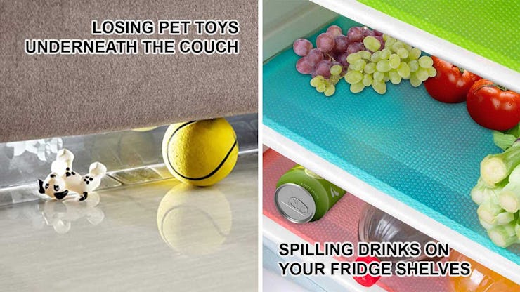 Solution: These waterproof mats that are easy to cleanRefrigerator spills can be really hard to clean, so why not put these shelf liners down? Their waterproof surface makes it easy to wipe them down — and since they’re nonslip, they can even help prevent spills from happening in the first place. Choose from four colors: blue, clear, gray, or an assortment of blue, green, red, and clear.