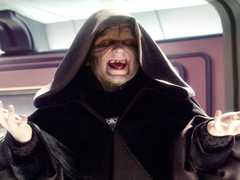 After playing it cool for three movies, Sheev Palpatine reveals his true identity in Revenge of the Sith when confronted by Mace Windu and a handful of disposable Jedi. Unlike his friends, Mace puts up a pretty good fight and manages to redirect Palp’s Sith lightning back at him, permanently melting his face into the version we saw in the original Star Wars films.