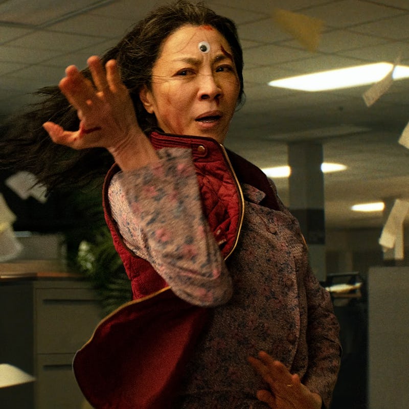 In the new sci-fi action-comedy Everything Everywhere All at Once, directed by the filmmaking duo Daniels (Daniel Scheinert and Dan Kwan), a middle-aged Chinese immigrant becomes an unlikely hero when she harnesses the talents of her different lives that exist in infinite parallel worlds. The riotous picture from A24 stars Hong Kong icon Michelle Yeoh as Evelyn, a laundromat owner who is quite literally living her worst life.