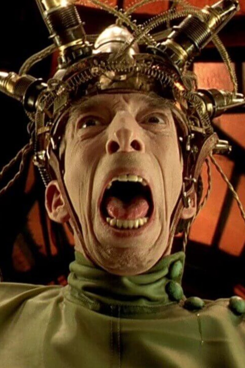 But then another Santa Claus appears, and another, and another, until the room is filled with them. The little boy’s smile vanishes, happiness twisting into fear as he grabs his favorite stuffed animal and tries, in vain, to escape the room. The walls begin to twist and bend, reality wavering as the boy’s dream becomes a nightmare. The next thing we see is that of an older man screaming in pain — a strange mechanical helmet strapped to his head.