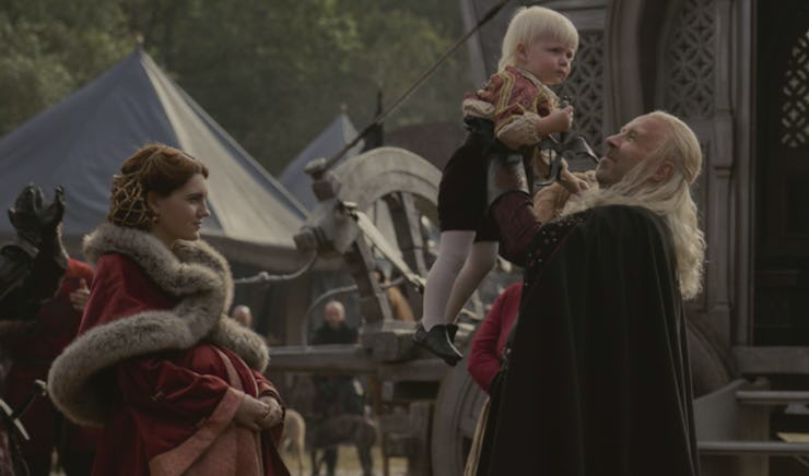 Aegon II Targaryen, son of King Viserys I Targaryen (Paddy Considine) and Alicent Hightower (Emily Carey), is but a golden-haired toddler in Episode 3 of House of the Dragon.