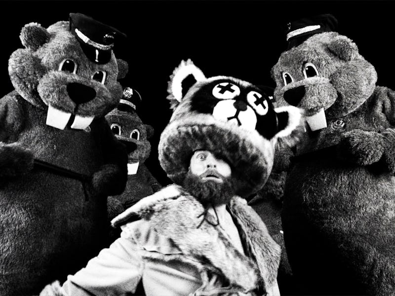 Hundreds of Beavers is the brainchild of Mike Cheslik, a Milwaukee-based indie filmmaker and VFX artist. The silent black-and-white movie stars Ryland Tews as Jean Kayak, an applejack-seller-turned-fur-trapper after a bunch of beavers (the aforementioned mascot costumes) burn down his distillery. He is dead set on two goals: wreaking havoc on the beavers and earning the hand of The Furrier (Olivia Graves.)