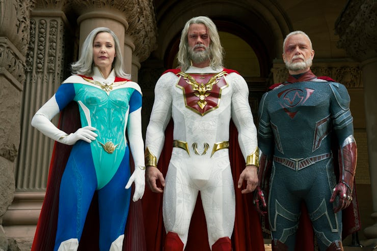 From left to right: Leslie Bibb, Josh Duhamel, and Ben Daniels in their starring roles as the superhero team the Union in Jupiter's Legacy.