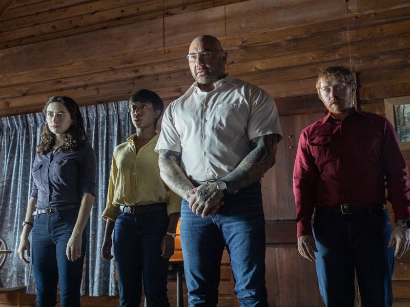 In Knock at the Cabin, eight-year-old Wen (Kristen Cui) is spending the weekend with her two loving fathers, Eric (Jonathan Groff) and Andrew (Ben Aldridge), at a scenic riverside building of some sort when she’s approached by a large stranger, Leonard (Dave Bautista). Along with three others — played by Nikki Amuka-Bird, Abby Quinn, and Rupert Grint — the strangers break into the property and deliver Wen’s family a horrifying ultimatum.