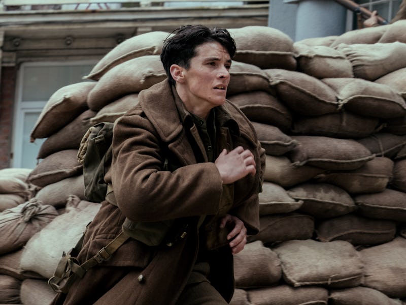 Dunkirk’s plot is made up of three timelines, all of which stretch at varying lengths — a week, a day, an hour — and intersect at critical moments: on the ground, in which three soldiers (Fionn Whitehead, Aneurin Barnard, Harry Styles) make attempts to escape that end in Sisyphean defeat; on the sea with a civilian sailor (Mark Rylance), his son (Tom Glynn-Carney), and a handyman (Barry Keoghan) who pick up a shell-shocked soldier (Cillian Murphy); and up in the air, with RAF pilot Farrier (played by Tom Hardy) flying on a limited tank of fuel.