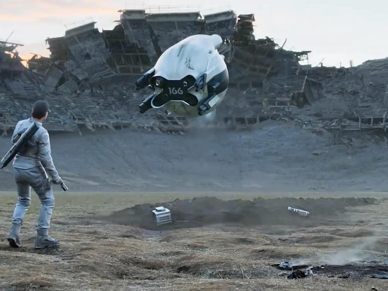 Cruise plays Jack Harper, the last repairman on Earth following an attack by a mysterious alien race called “the scavengers” who struck first by blowing up the Moon. An epic battle ensued. Earth won, but it was a pyrrhic victory. The planet's nuclear weapons were used with abandon and the planet is unlivable. So humanity is planning a mass exodus to Titan, a moon of Saturn, on a giant spaceship called the Tet.