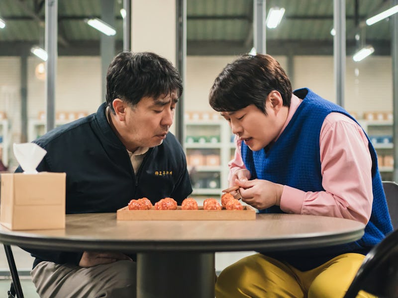 Min-ah keeps her human form in an Interstellar-esque void, and the series opens with her asking, “Which is harder: living as a chicken nugget for five days or a human for 50 years?” That philosophical thesis is far more sophisticated than the series’ initially comedic tone, but it earns its introspection by the end. After early visual gags where Baek-joong and Seon-man realize Min-ah got mixed up in a box of normal, non-human chicken nuggets, they start to pick at the central mystery of the purple machine, and that’s when things get weird.