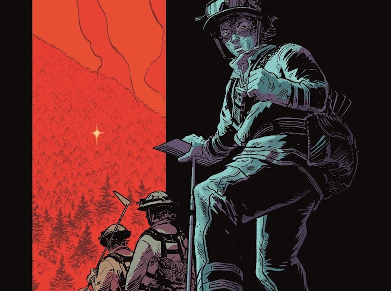 Snyder’s first attempt to meet that challenge is Dark Spaces: Wildfire, a five-issue comic about female inmates in California who fight forest fires for two dollars a day. In Snyder’s comic, with art by Hayden Sherman and Ronda Pattinson, the firefighters plot to rob one of the many affluent estates their work protects during an inferno.