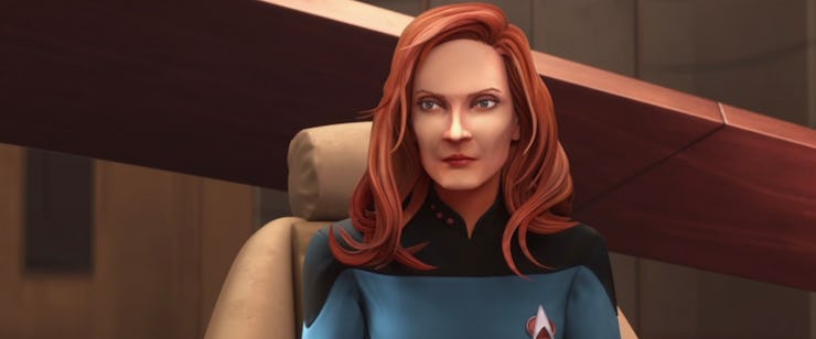 Via e-mail, reps for Paramount+ have confirmed that Gates McFadden recorded all-new dialogue for Crusher. But in the case of the other characters, we’re dealing with archival dialogue from existing episodes and movies edited together to make it seem as though they’re talking to Dal.