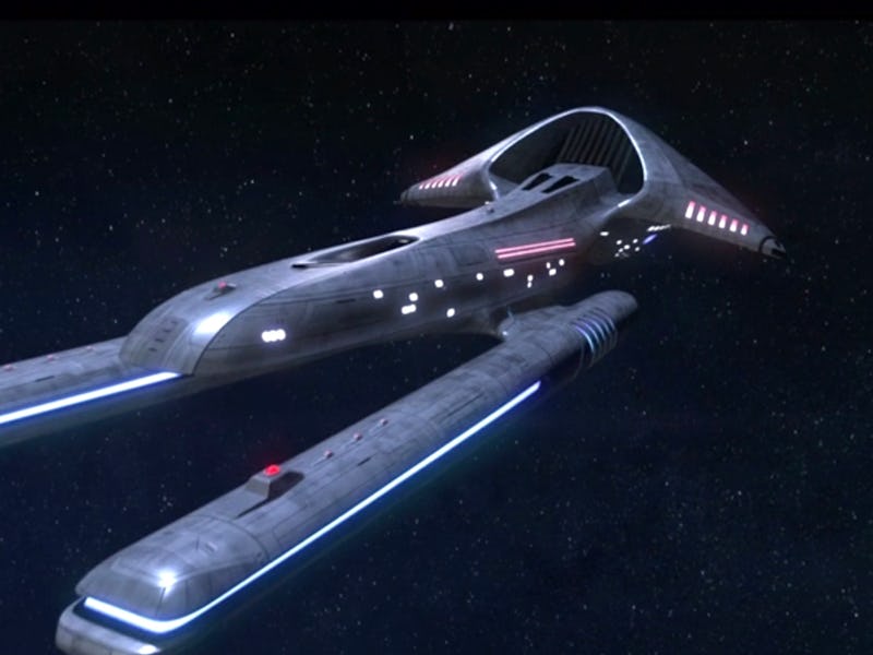 It turns out Gywn’s father, the villainous and single-minded Diviner of the alien species known as the Vau N’Akat, is a time traveler. Up until now, Prodigy has suggested that Gywn (Ella Purnell) and the Diviner (John Noble) are the last of their species, and that the planet Solum is unpopulated. However, in “A Moral Star Part 2,” we learn the Diviner actually traveled back in time over 50 years from the future to prevent Starfleet from making First Contact with Solum in the first place.