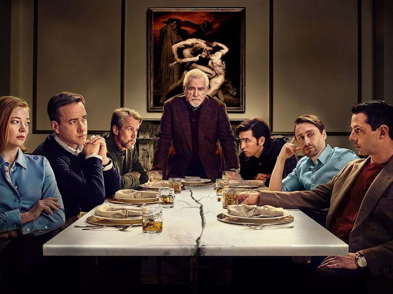 Tom (Matthew Macfadyen) is opposite Shiv (Sarah Snook), Kendall opposite his dad, and Roman (Kieran Culkin) has his eyes glued to Kendall. Cousin Greg (Nicholas Braun) and Connor (Alan Ruck) lurk behind, but this merely represents their distant relationship to the family, as Greg is a cousin and Connor is only a half-sibling to Kendall, Shiv, and Roman.