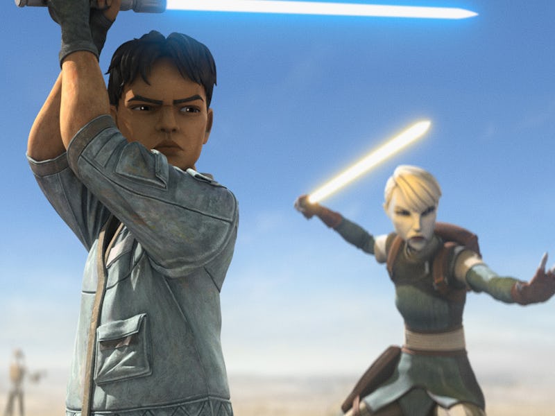 So Ventress sets off with Lyco, and in Episode 3, they end up on a desert planet. There, they get roped into helping some settlers defend themselves against raiders, but Lyco suddenly yells that the settlers were stealing the raiders’ water. “You understand them?” Asajj asks, to which Lyco replies, “I am a Jedi.” He then has a conversation with the raiders, even though this is the first time he’s ever heard their language.