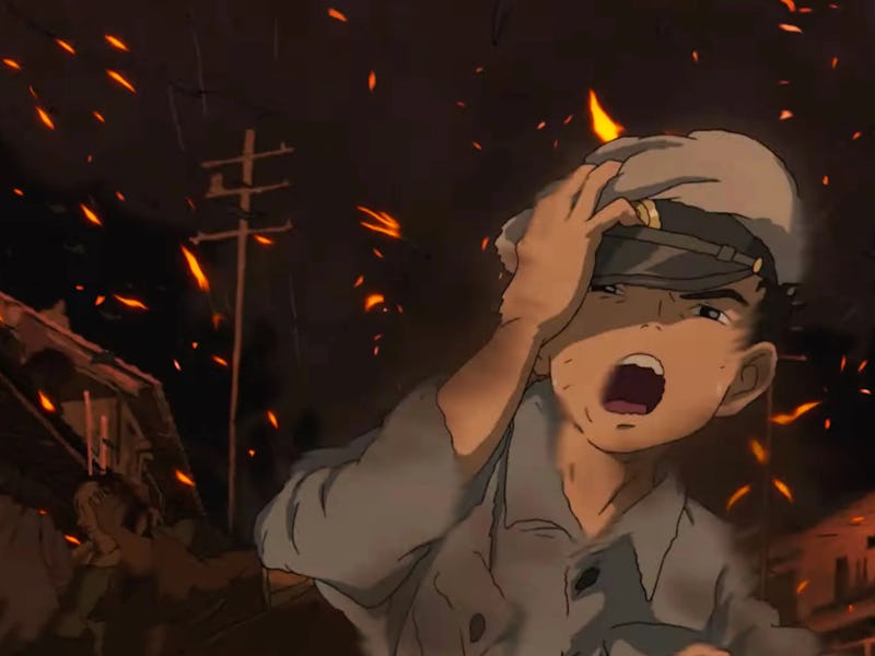 In the opening minutes of The Boy and the Heron, director Hayao Miyazaki does something he’s never done before. The soft, rounded character designs that have come to characterize Studio Ghibli’s signature style start to morph and mutate. The shadows around them come alive, as if the grime of war has become sentient. Fire licks the side of the frames as if it will escape. It’s the height of World War II, and 11-year-old Mahito is running through the streets of Tokyo, pushing his way through terrified onlookers toward the burning hospital where his mom is currently trapped.