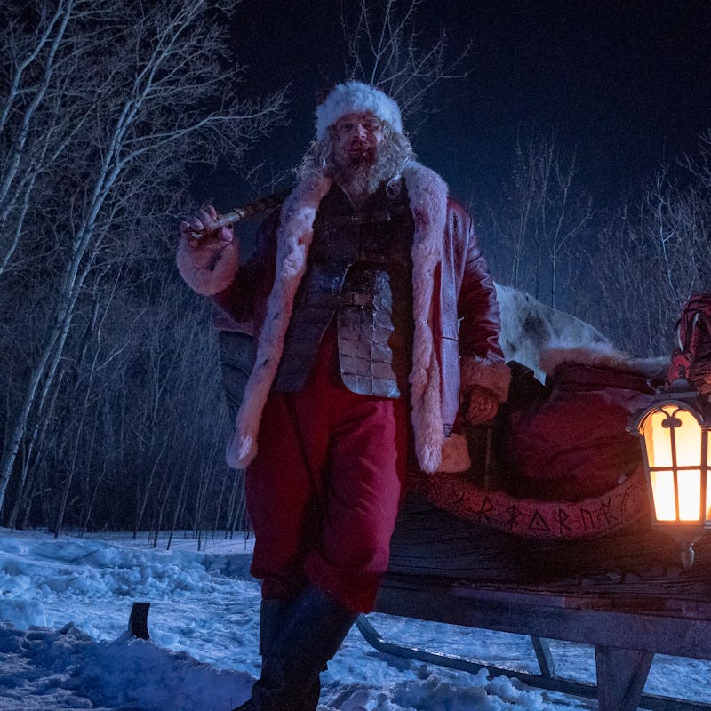 While Santa goes on a drunken Christmas Eve sleigh ride, a pathetic family party hosted by an uber-wealthy matriarch is taken over by its gun-toting staff, all mercenaries led by “Scrooge” (John Leguizamo) on a heist to steal her $300 million. Young Trudy (Leah Brady), held hostage with the rest of her dysfunctional family, still believes in Santa Claus, so it’s a good thing when Santa, who’s actually an ancient Viking berserker à la The Northman cursed by unknown forces to spread holiday cheer, unwittingly arrives at the house to save the family.
