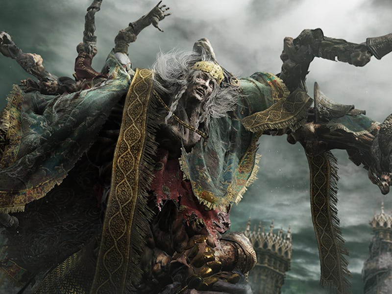 There’s also an elderly, long-haired human wearing a crown, holding up what looks like a giant's arm (the king has his left hand shoved inside the arm ... gross!). Five other large arms reach out to grab him, which jives with all the body horror we see in games like Dark Souls and Bloodborne. In the gameplay trailer, that same king seems like a Big Bad who has some horrifying mutations and many arms on his body.