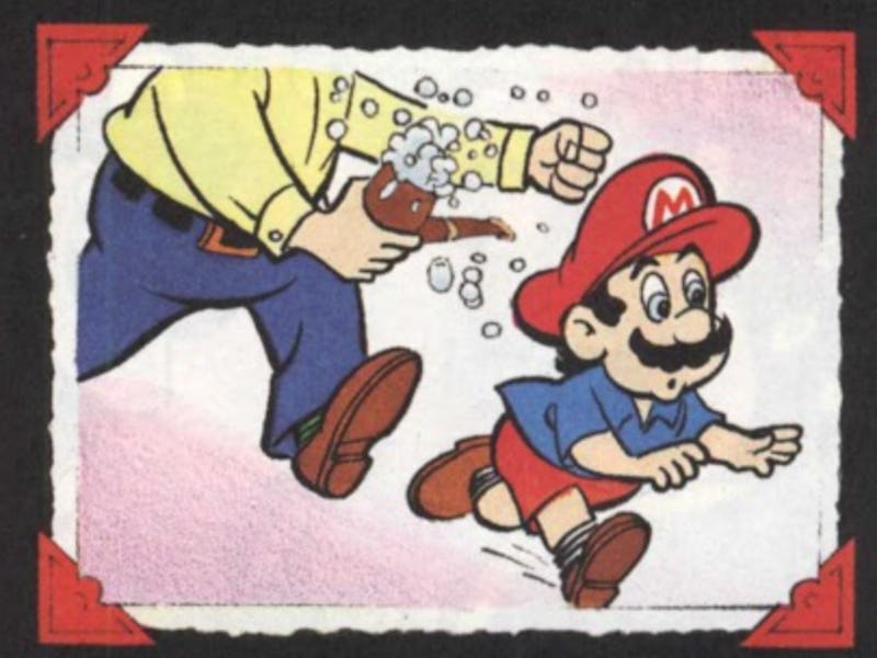 The comic depicts Mario’s early life from infancy to adulthood. It shows that Mario has always had two defining features: a mustache and a talent for pipes. According to the comic, after being born with a full head of hair and stubble, Mario began fixing pipes around his childhood home. He began by repairing the kitchen sink but eventually moved his talents to his father’s smoking pipe. Mario forced the smoking pipe to spew literal water. This prompted his father to chase a young Mario around their house with apparent frustration.