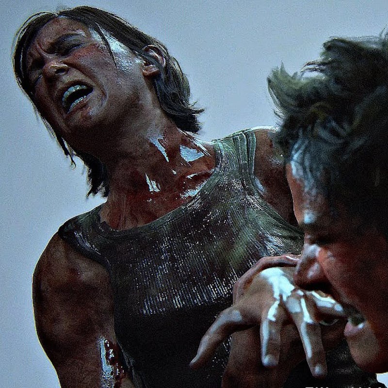 In the grisly scene, the two malnourished and wounded adversaries grapple and claw at one another. Abby bites off Ellie's fingers and Ellie almost drowns Abby.