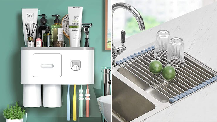 If you want a place for everything so you can put everything in its place, this wall-mounted shelving unit designed for the bathroom is that place. There are covered hooks for your toothbrushes, cups that magnetically hang upside down, a toothpaste dispenser that’s easy to clean, a shelf for your sundries, and a drawer to secret away small items. It comes with a peel-and-stick mounting system.
