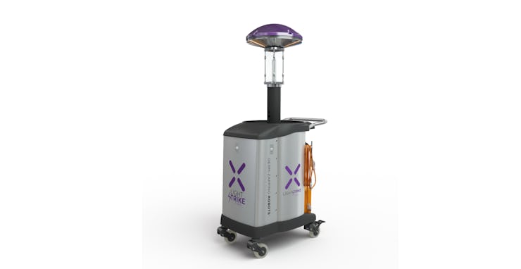 Recent media coverage of the Xenex Disinfection Service's "LightStrike Germ-Zapping" bot -- a purple-capped, semi-autonomous machine that's as tall as a small child -- is designed to scuttle through hospital rooms (and now hotel rooms) with a xenon light column that emerges from its base. The UV light annihilates germs at a molecular level.