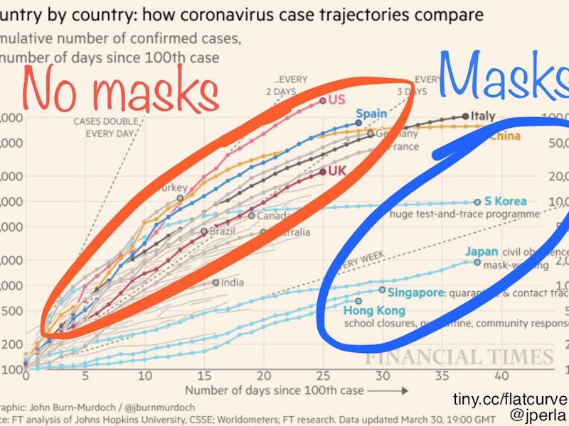 You probably haven't heard of the Curve Crushers, but you are connected to them. They are who first posted the doctored Financial Times graphic that compares coronavirus cases in countries with masks to cases in those without. It has since been shared by science reporters and the mayor of Medellín, Colombia. It appears in French news reports and on national television in Tunisia. It's seemingly, everywhere.