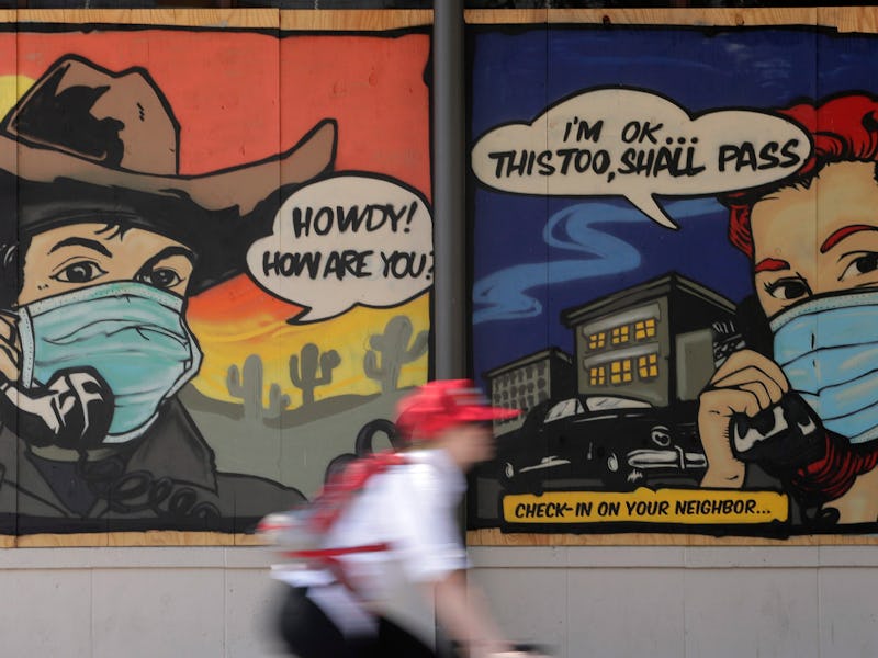 A person walks by a mural on a boarded-up window on April 28, 2020, in Seattle, Wash., where public street art has sprung up all over the city.