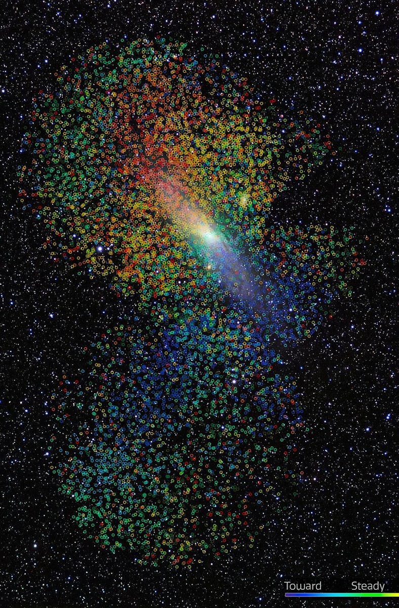 Each dot in this image represents a single star in the Andromeda Galaxy. Red dots are stars that are moving away from us, blue dots are stars that are moving toward us, and green and yellow dots are more or less keeping the same distance.