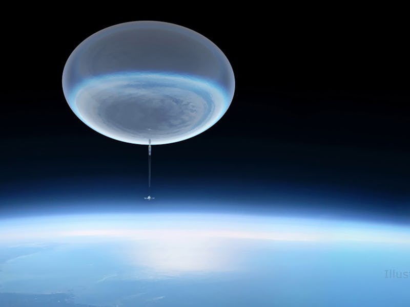 An illustration of a high-altitude balloon going up into Earth's upper atmosphere, similar to how the mission's balloon will carry the telescope into space.