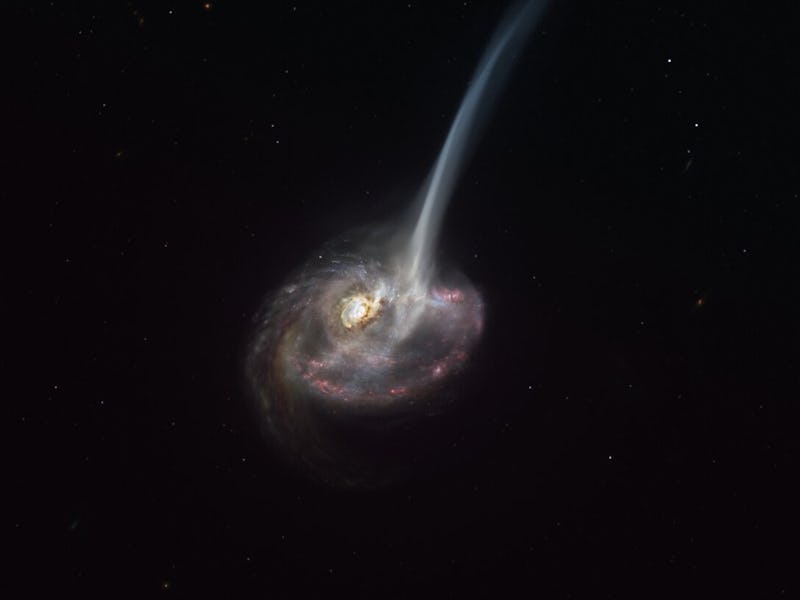 In this artist's impression of the dying galaxy in question, a tail of ejected gas can be seen stemming from the galaxy.