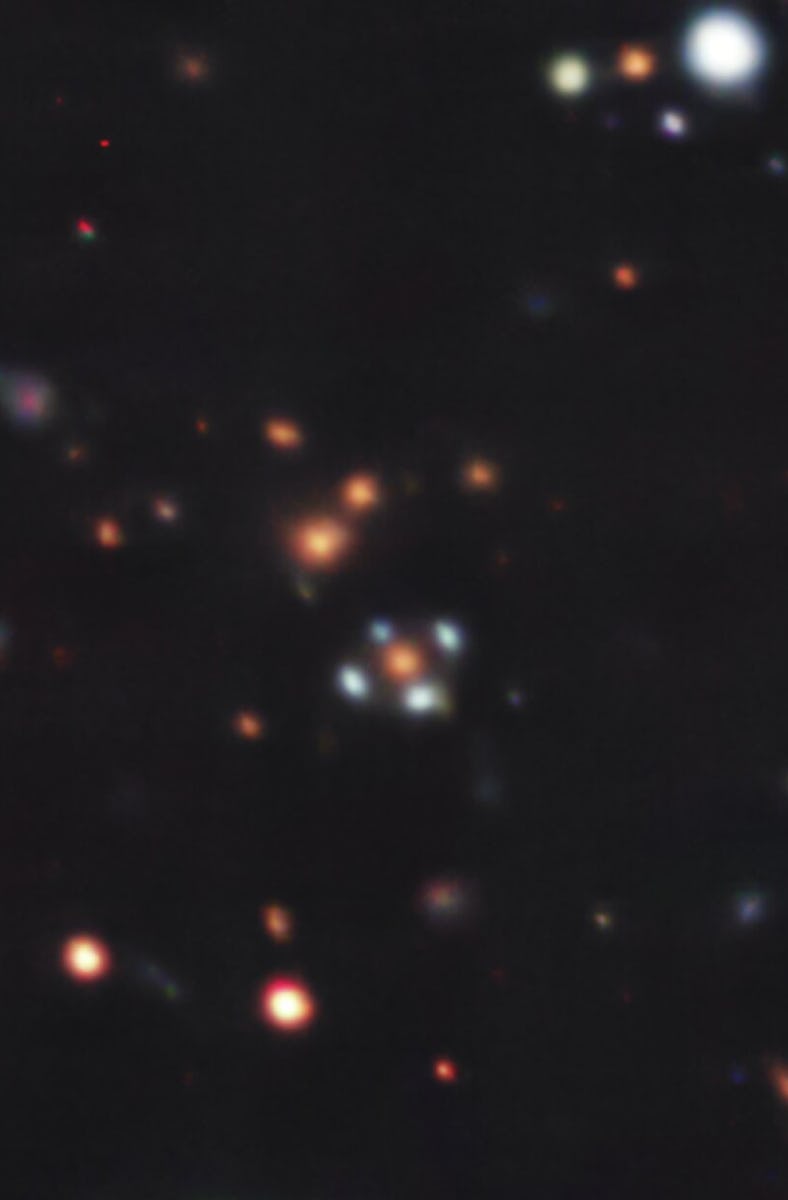 The four light blue spots surrounding the little orange blob in this image from the Very Large Telescope (yes, that is its official name, VLT for short) are actually four images of the same galaxy, projected by a gravitational lens in a rare formation called an Einstein cross.