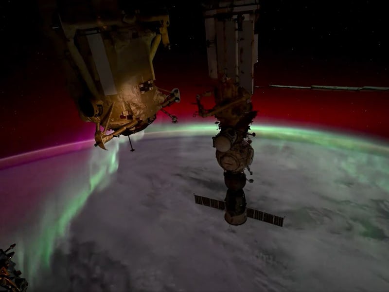Part of the station (and a docked Soyuz crew capsule) hovers in the foreground, the glittering stars of deep space in the distance, and the green and red lights of the auroras dance across Earth's upper atmosphere. At about the 45-second mark, the light of sunrise (which happens about every 90 minutes as the ISS zips around the planet) bathe the docked Soyuz capsule in a pale blue glow.