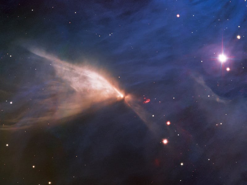 The star in question is at the center of the image, a young, cool star with a lower mass than the Sun. It’s emitting streams of fast-moving gas, which carved a tunnel through the cloud of dust.