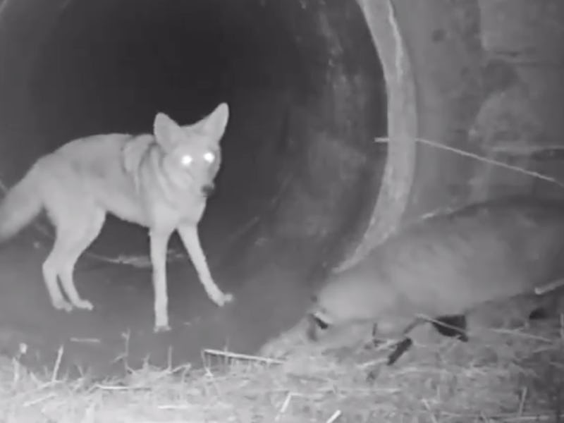 In the video, a coyote and a badger can be seen traveling together through a giant drain pipe to avoid crossing a busy highway in California.