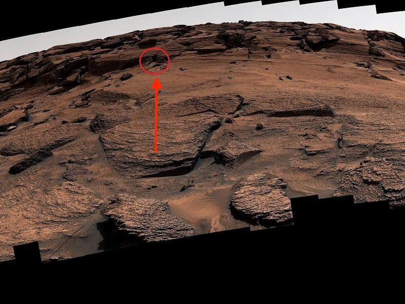 The “door” was imaged by NASA’s Curiosity rover on May 7 on the slopes of Mount Sharp, the central massif within Gale crater, where it landed in 2012. Described on one website as a “pharaonic tomb door” because of its resemblance to some ancient Egyptian remains, it is, in fact, only about one foot high.