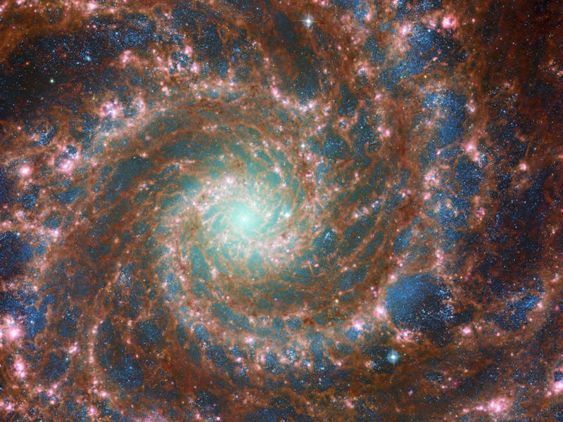 This image — focusing on the center of the Phantom Galaxy and the spiral arms of stars and dust radiating out from it — combines a false-color image from MIRI with an earlier image from Hubble, so we’re seeing features of the galaxy that normally aren’t visible in the same wavelengths of light. Notice the filaments of matter that seem to form lattices of gas and dust through the spiral arms; they’re much more visible in infrared than in optical or ultraviolet light.