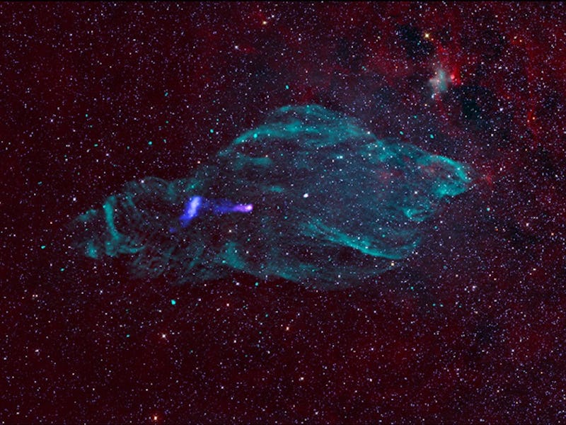 That something, the researchers surmise, seems to be a shock wave in the gassy interstellar medium of the nebula. Shock waves act like giant cosmic versions of the Large Hadron Collider, accelerating electrons in the jets to ludicrous speeds.
